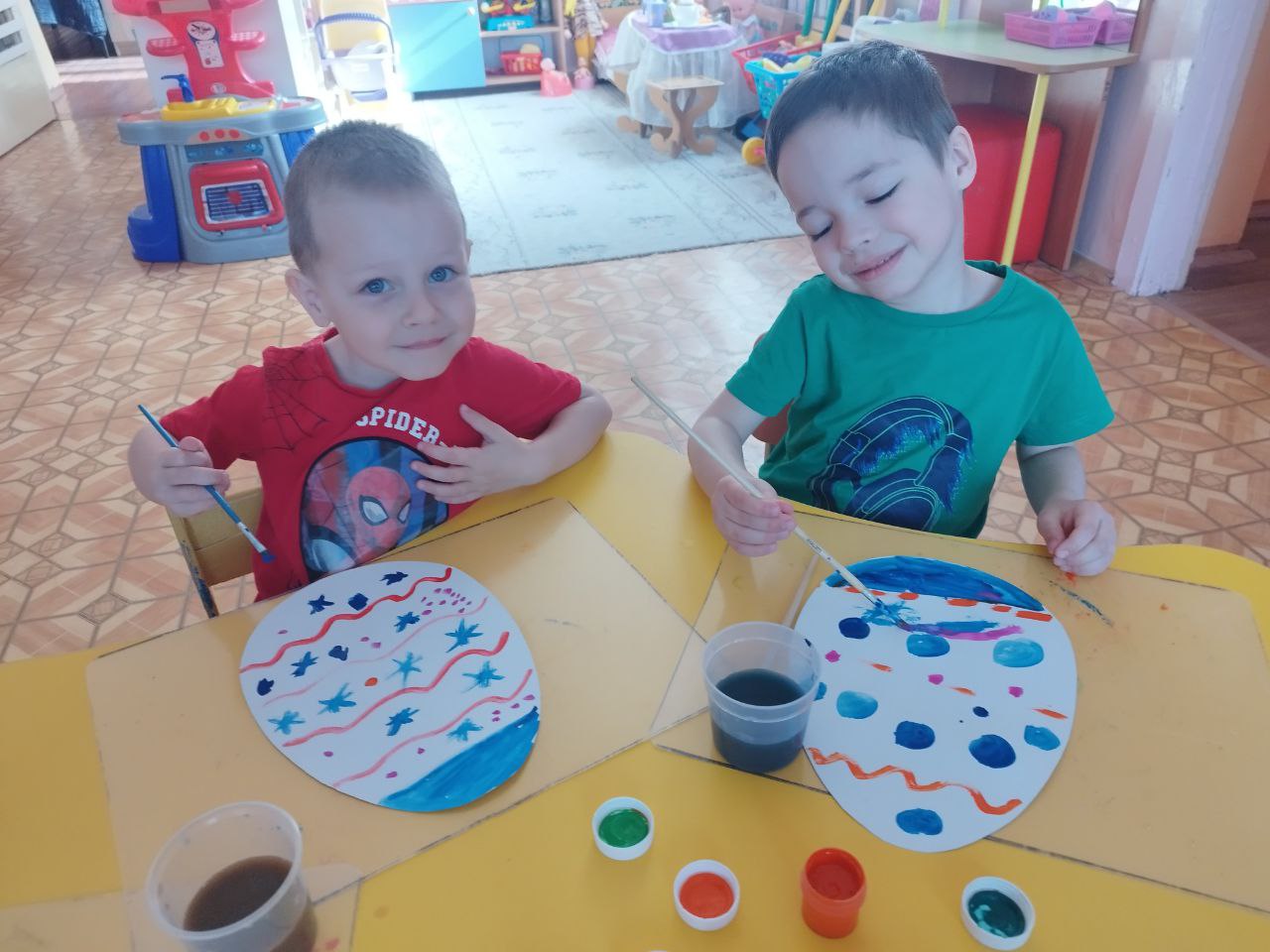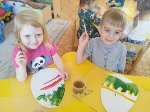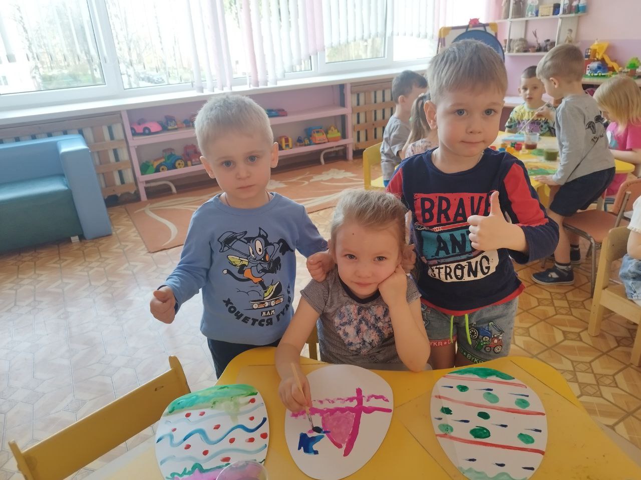 По следам прошедшего большого праздника , ребята нашей группы прослушали и разыграли сказку «Курочка Ряба» и разукрасили пасхальные яйца . Использовали яркие краски и разные узоры.