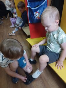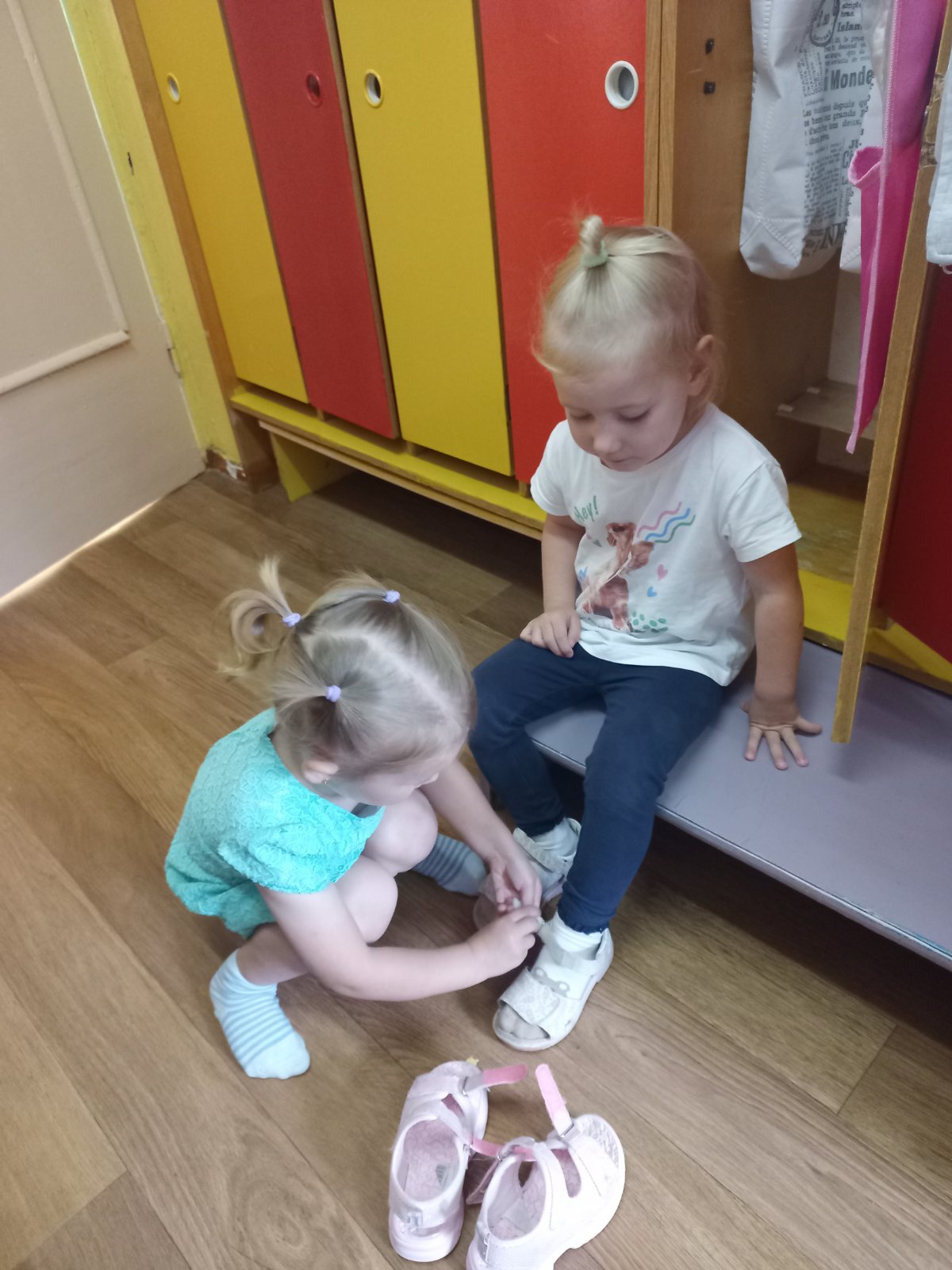 Ребята младшей группы не только учатся самостоятельно одеваться, но и помогать своим друзьям.